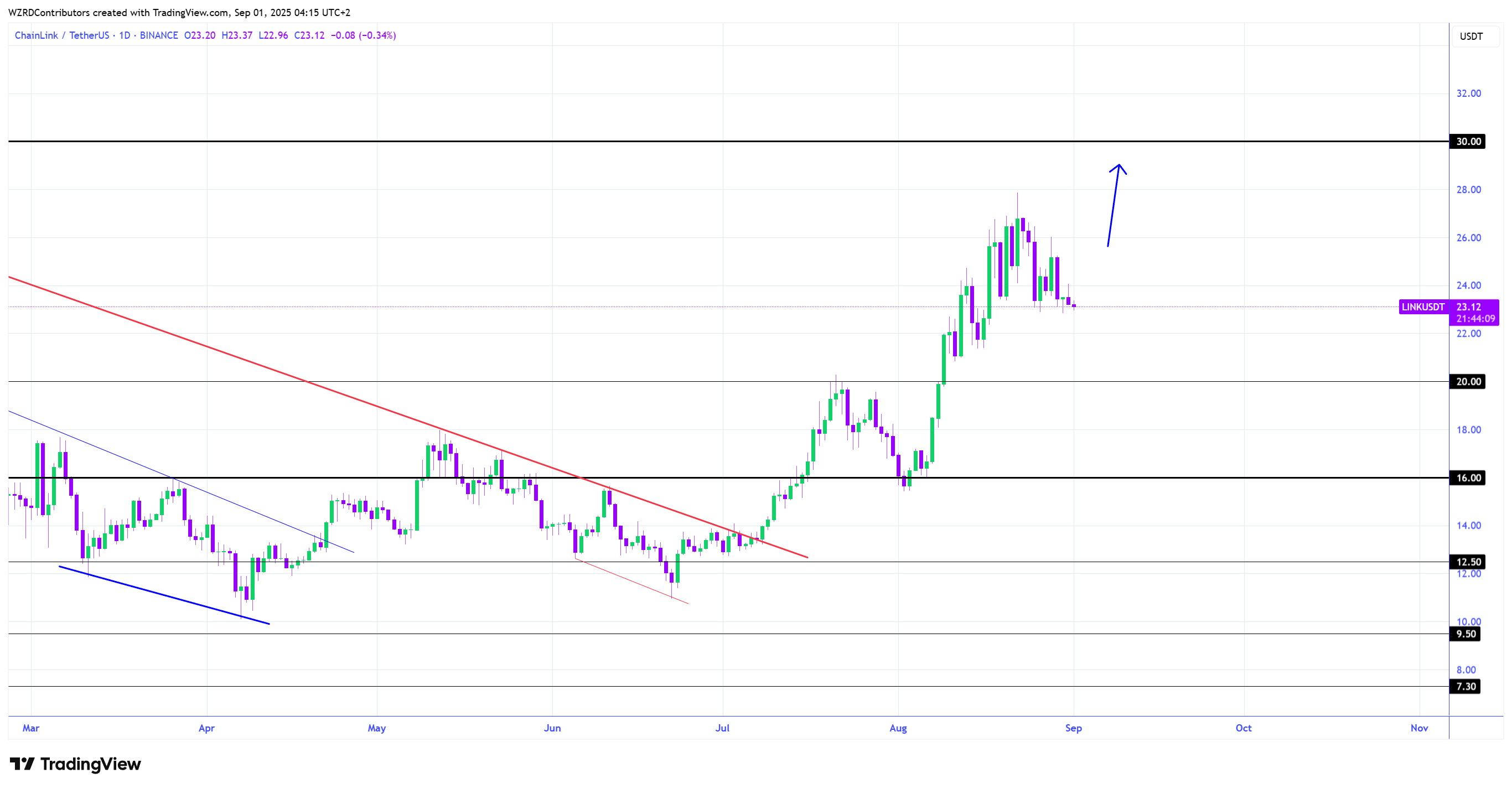 Still, LINK’s most recent monthly candle closed strongly bullish. September is expected to be an upward phase, with a breakout above $24.85 potentially extending the rally further.
