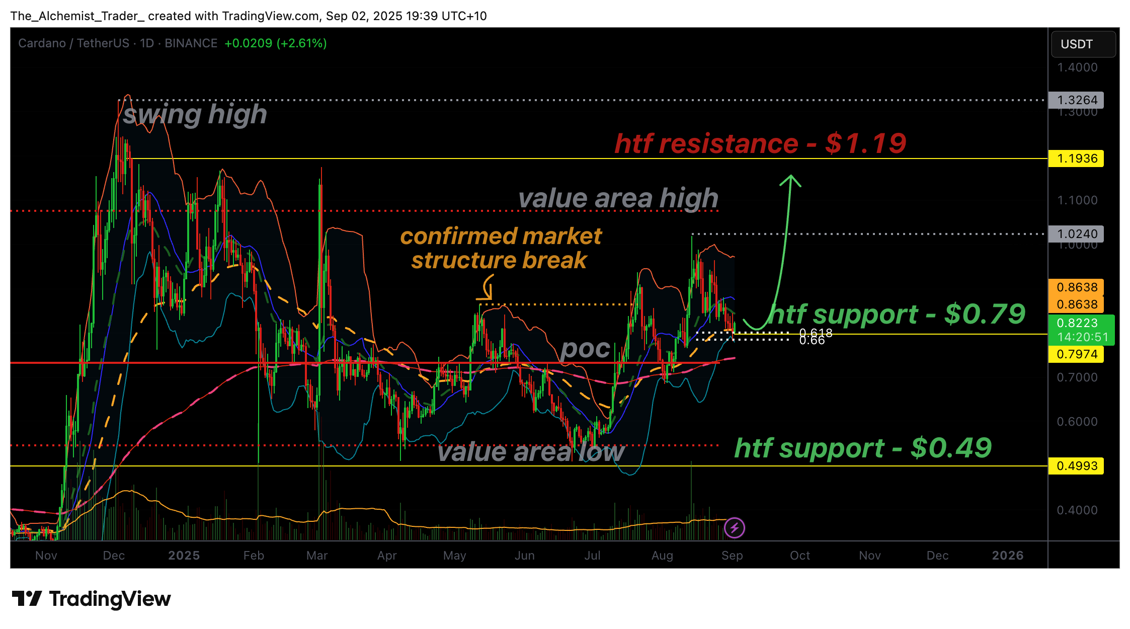 Cardano (ADA) is currently holding firm above a major high time frame support level at $0.79. This zone has multiple technical confluences, reinforcing its importance as a structural foundation for continuation higher. With theGrayscale ADA ETF deadline approaching, Cardano is also eyeing a breakout that could strengthen its bullish outlook. With bullish market structure already confirmed, ADA is positioning itself for a potential move back toward higher resistance levels.