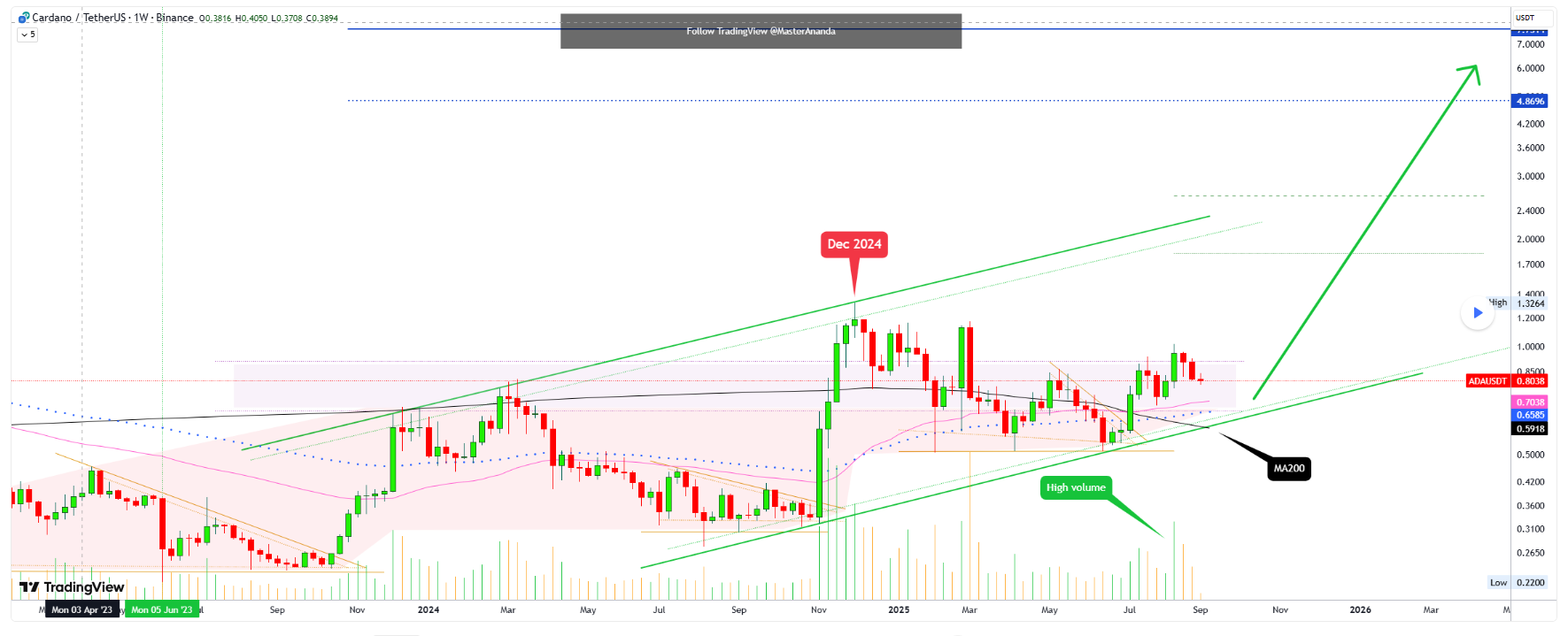 The analysis by Master Ananda is based on ADA’s weekly timeframe chart, where the token has been trading above key moving averages, EMA55, EMA89, and MA200, for seven consecutive weeks.
