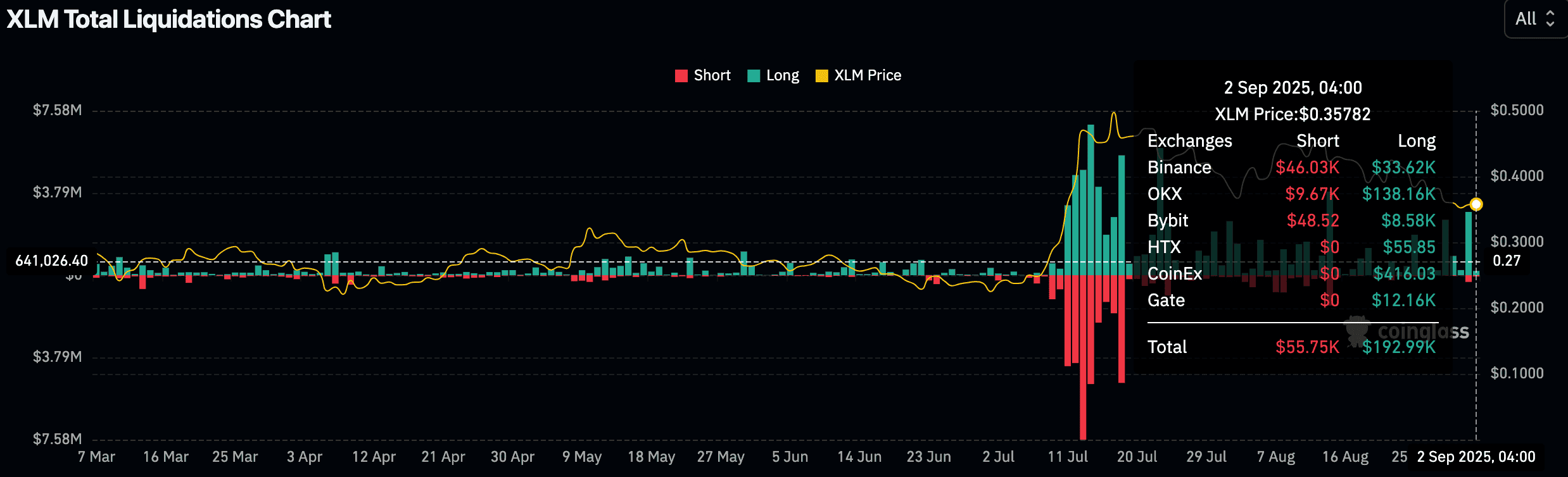 Recent liquidation data shows that long positions are being squeezed as XLM moves lower. On September 2, long liquidations reached over $192,900 compared with $55,750 in short liquidations.