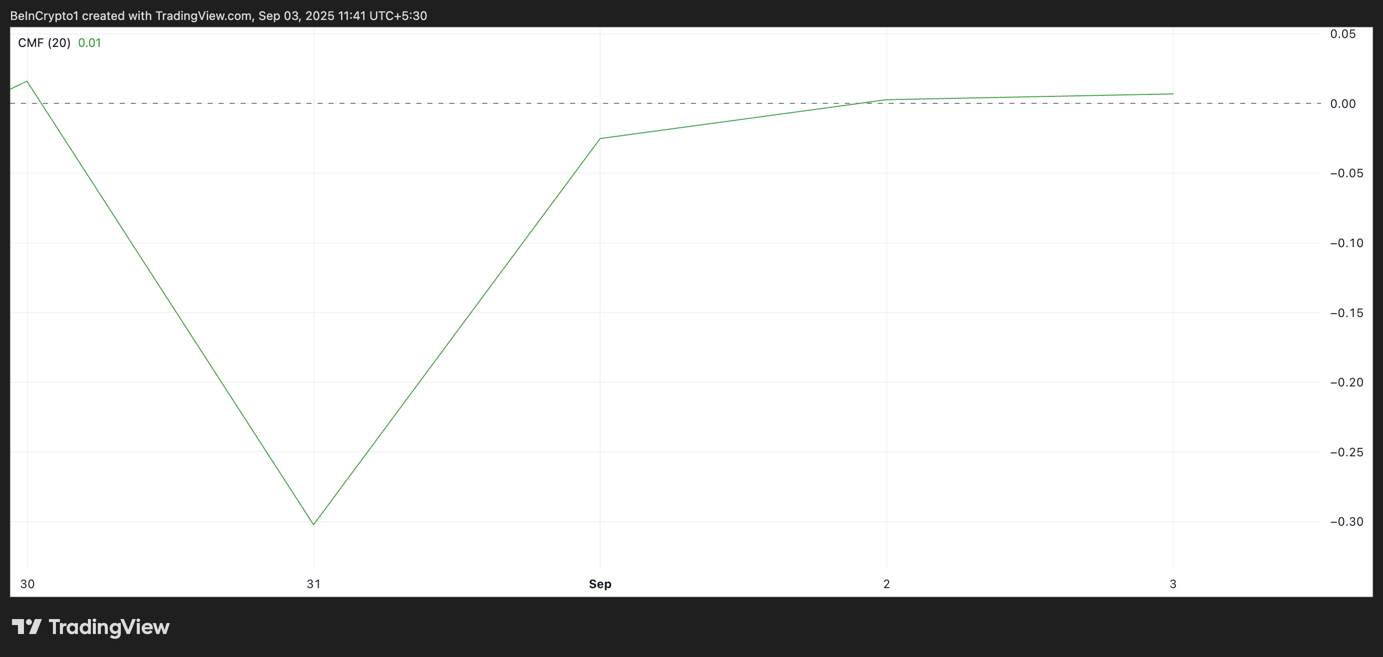 Readings from the FORM/USD one-day chart show that the altcoin’s Chaikin Money Flow (CMF) indicator has turned positive, reflecting stronger capital inflows into FORM. As of this writing, this momentum indicator is at 0.01 and is trending upward.