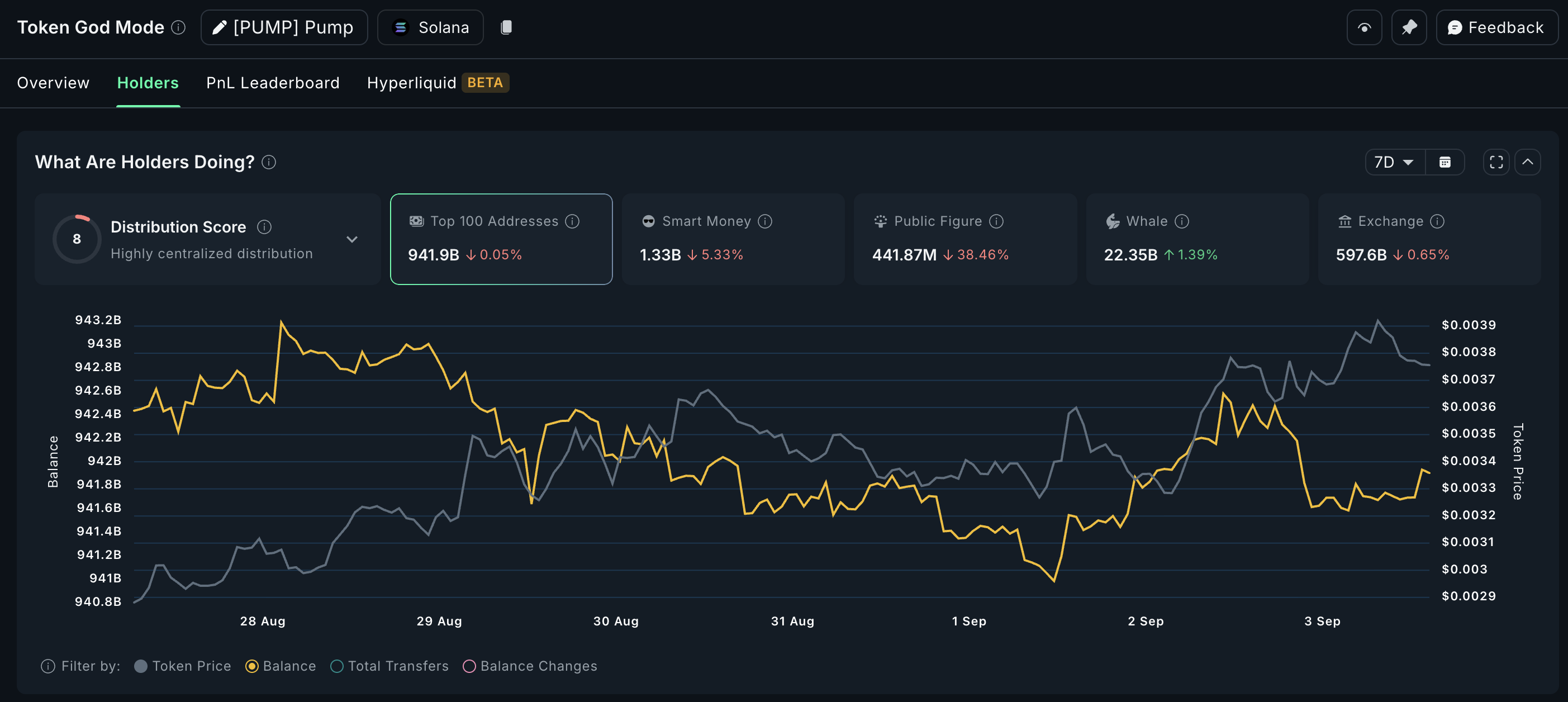 At the current price of $0.0038, wallet flows show diverging trends. The top 100 addresses trimmed slightly, dropping 47 million PUMP tokens, equal to about $179,000. Smart money balances fell 5.33% (around 74 million tokens, or $281,000) and public-figure wallets slid nearly 38% (276 million tokens, or $1.05 million).