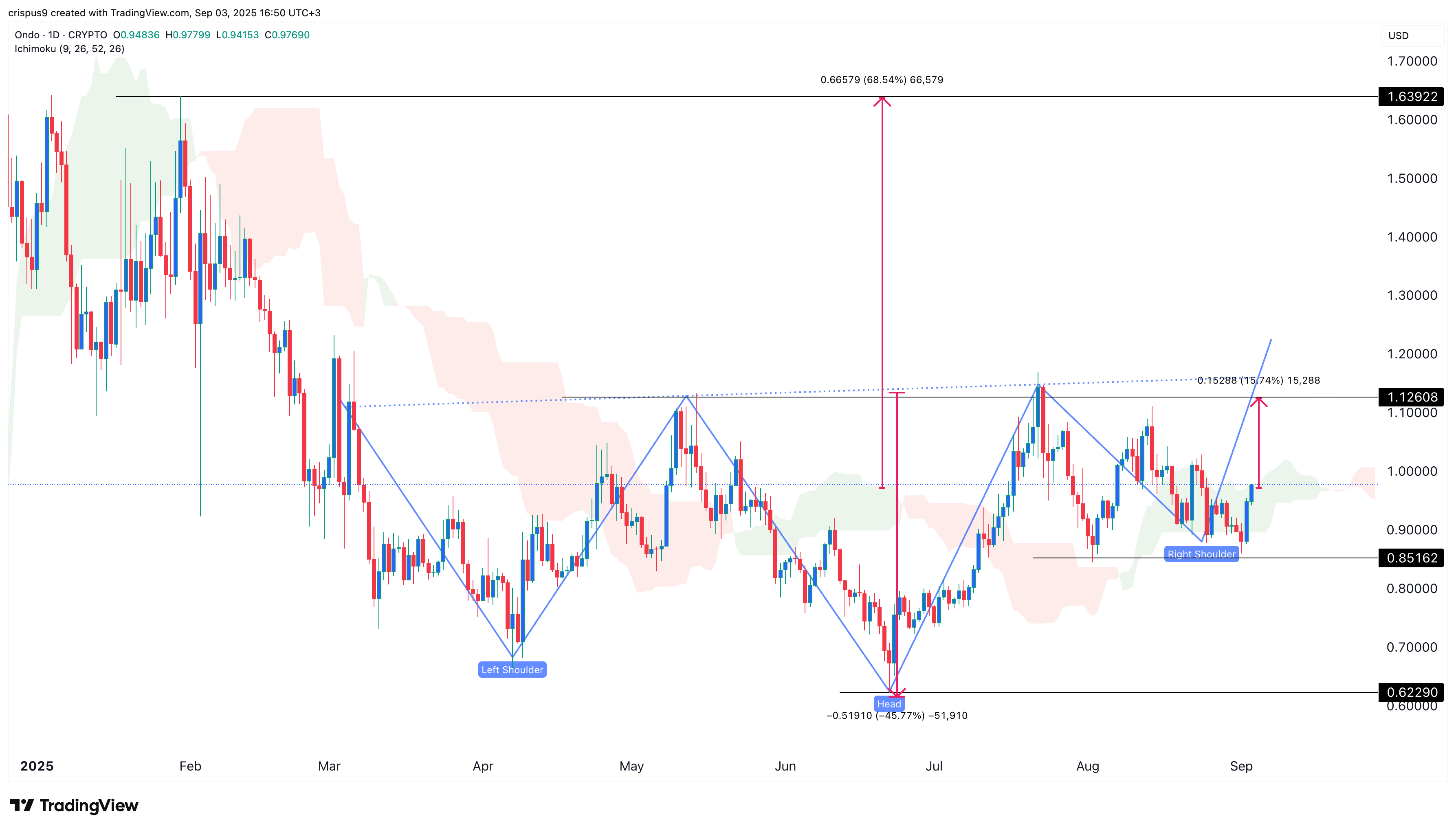Technical analysis points to more upside as the Ondo crypto price has formed a double-bottom pattern at $0.8516 and a neckline at $1.10.