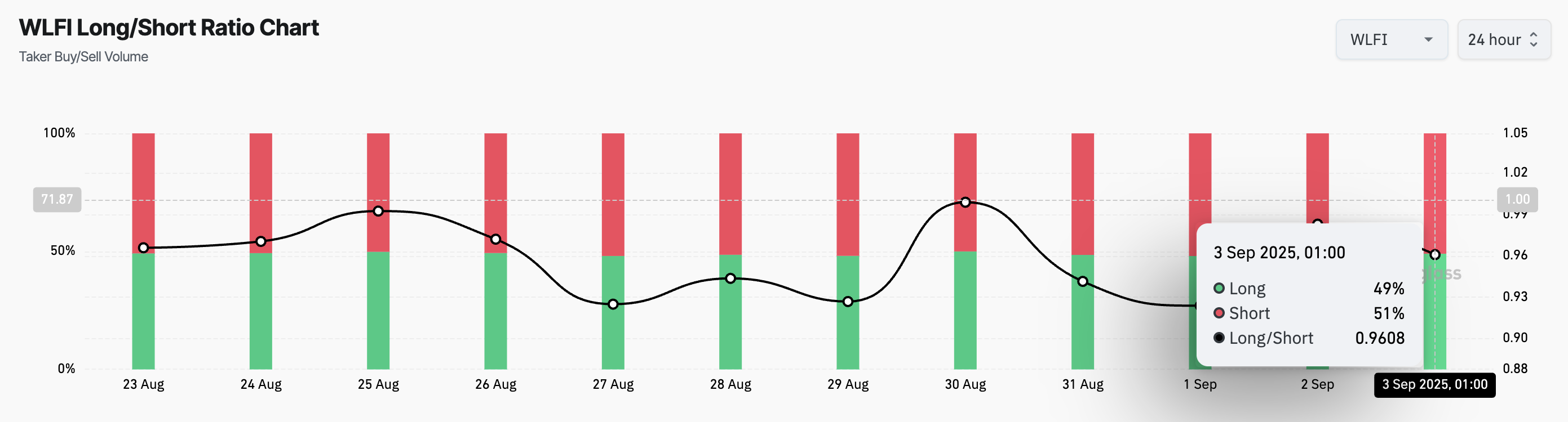 However, as with WLFI, a ratio below one means there are more short than long positions in the market. This reflects the prevalent bearish sentiment against WLFI, with its futures traders overwhelmingly betting on the asset’s price to decline rather than rise.