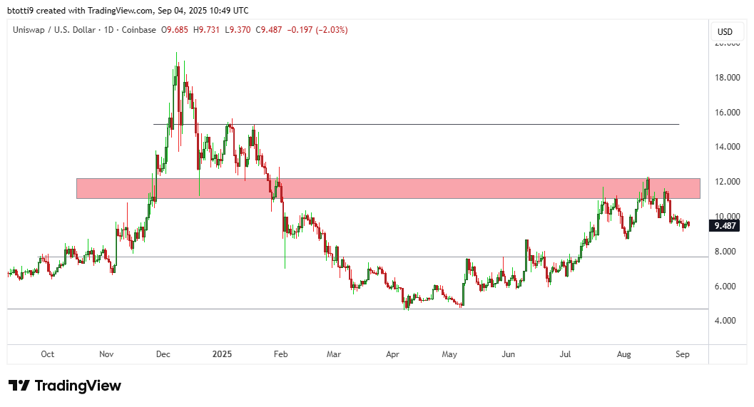 UNI’s price has dipped to $9.44, down 1% in the past 24 hours and 5.8% over the past week.