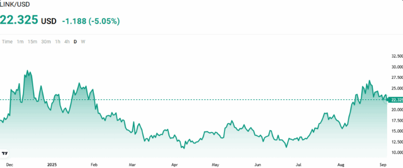 Chainlink trades at $22.325, reflecting a 5.05% decline in the latest session. The pullback follows a sharp rally from mid-year lows below $12. Profit-taking has emerged after peaks near $30, bringing consolidation near the low-$20 range.