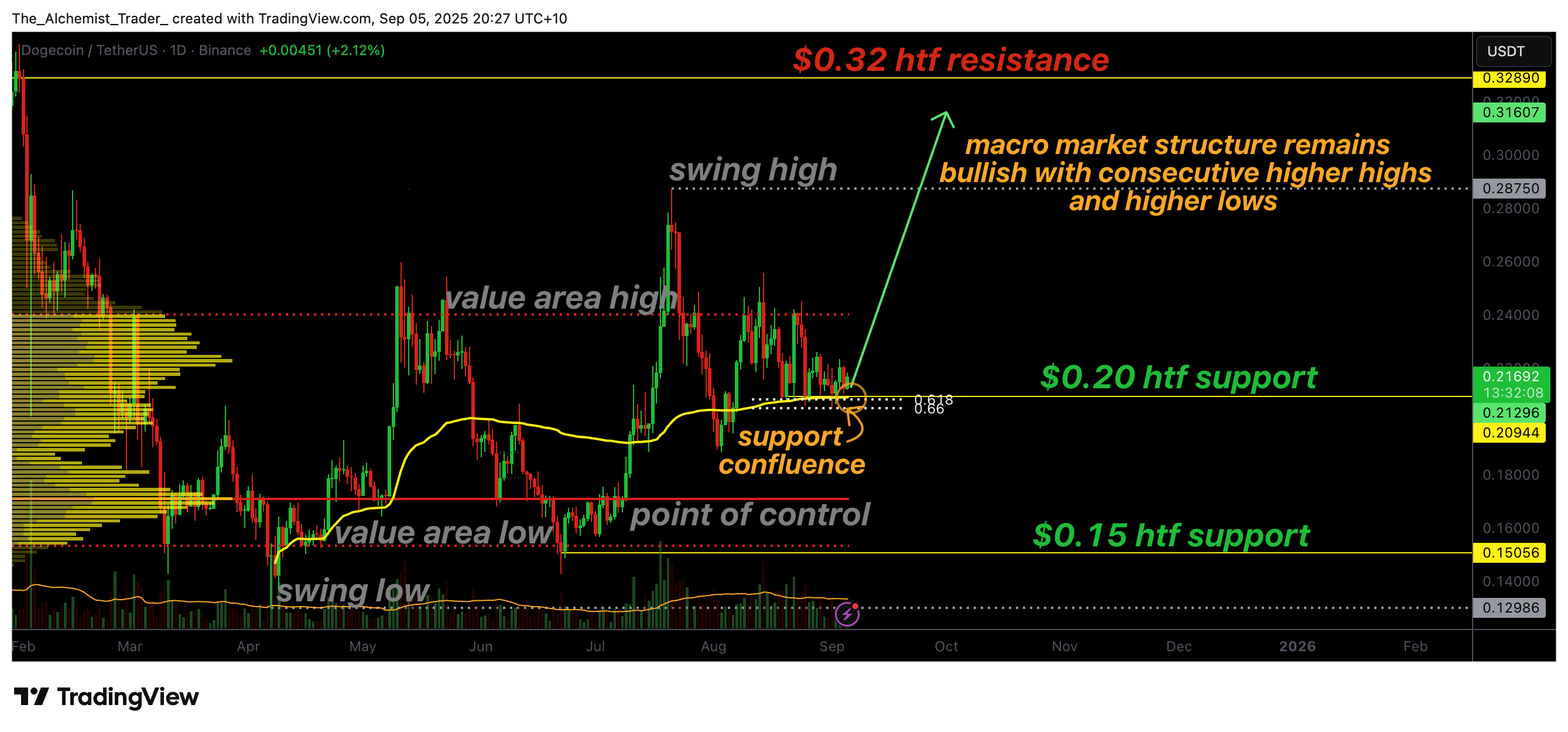 Dogecoin’s price is consolidating at $0.20 high-time-frame support, a region with multiple technical confluences. If this level holds, price action is well-positioned for a rotation toward $0.32 resistance.
