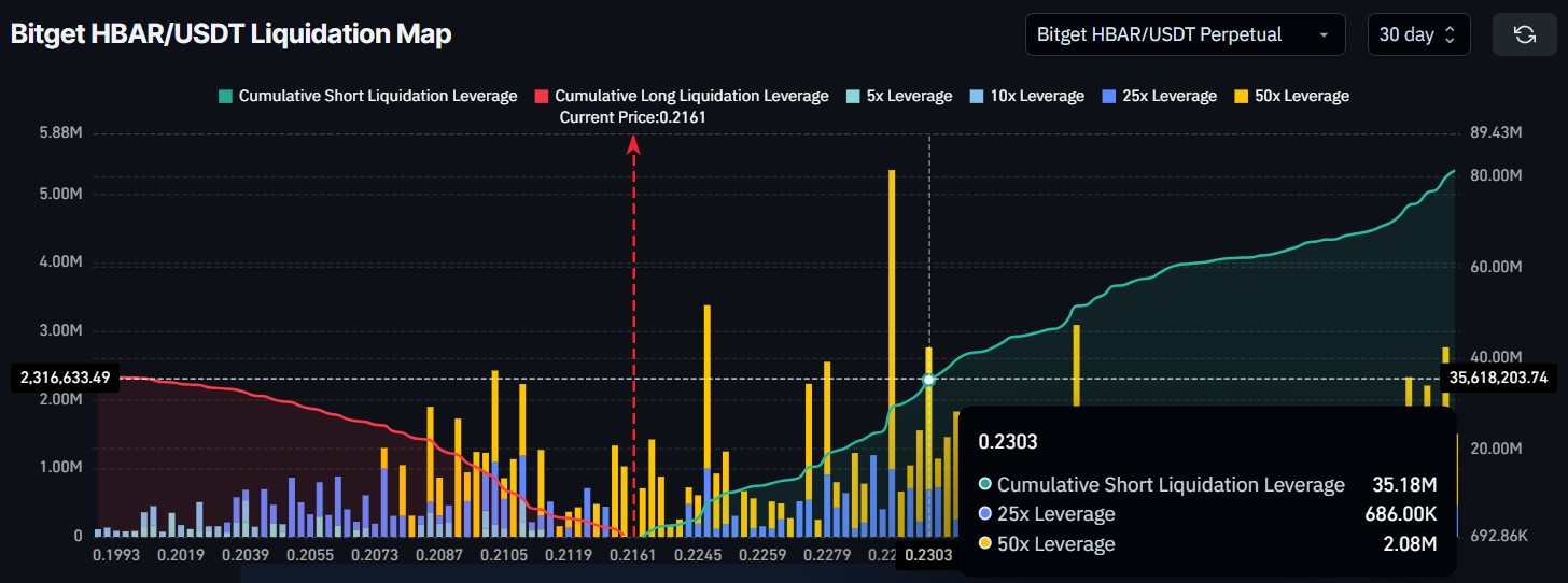 The liquidation map shows that more than $35 million in short positions could be liquidated if HBAR climbs to $0.230. Such a development would create a large-scale short squeeze, potentially driving further bullish momentum across the market. This would provide an opportunity for HBAR to extend its rebound.