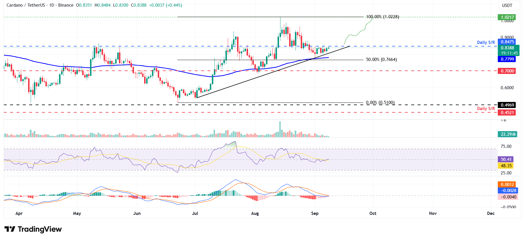 If the ADA closes above the daily resistance at $0.84 on a daily basis, it could extend the rally toward its August 14 high of $1.02.