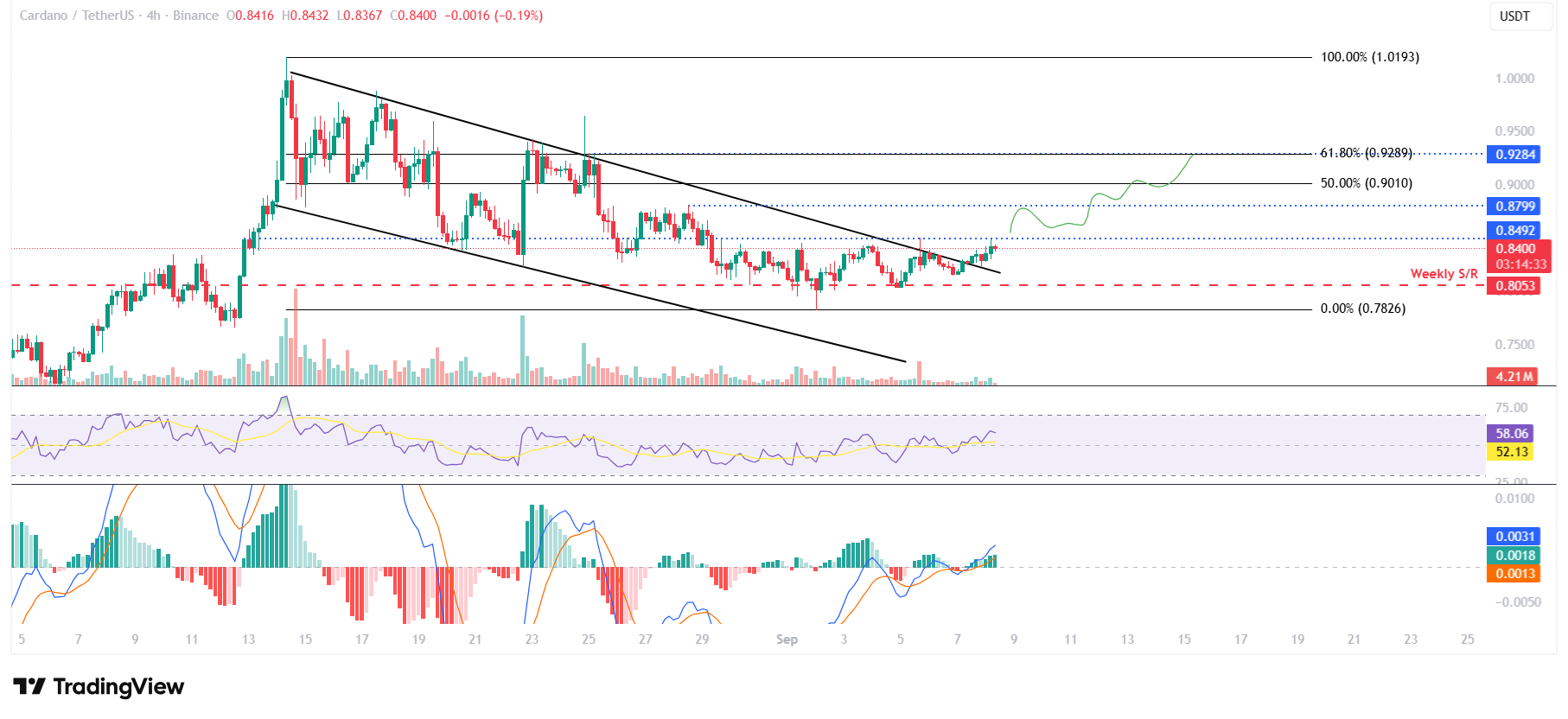 Cardano price on the 4-hour chart shows that it broke above the falling wedge pattern on Sunday and rose slightly. This pattern is formed by connecting multiple high and low levels with a trendline from August 14, and a breakout favours the bulls. At the time of writing on Monday, it trades at around $0.84.