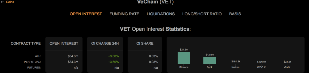 Derivatives data provides a clearer picture of growing conviction among traders. Total open interest for VeChain has climbed to $34.3 million, marking a 3.6% increase in the last 24 hours.