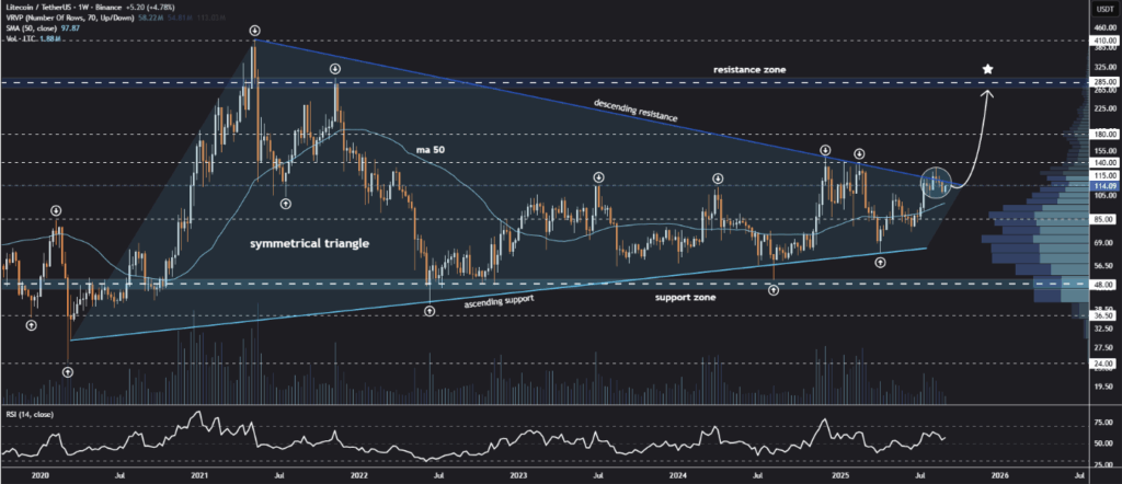 From a bigger picture standpoint, the weekly chart paints a more compelling picture. Litecoin has been tracing a symmetrical triangle since mid-2021, and currently tests the upper boundary of this structure at $114-115. Analysts suggest that a close above this range and the 50-week moving average could open the door to targets at $140-$155, and possibly $265-$285 if the momentum picks up. LTC could see a retest of the 2021 high near $410 in a more extended bullish scenario.
