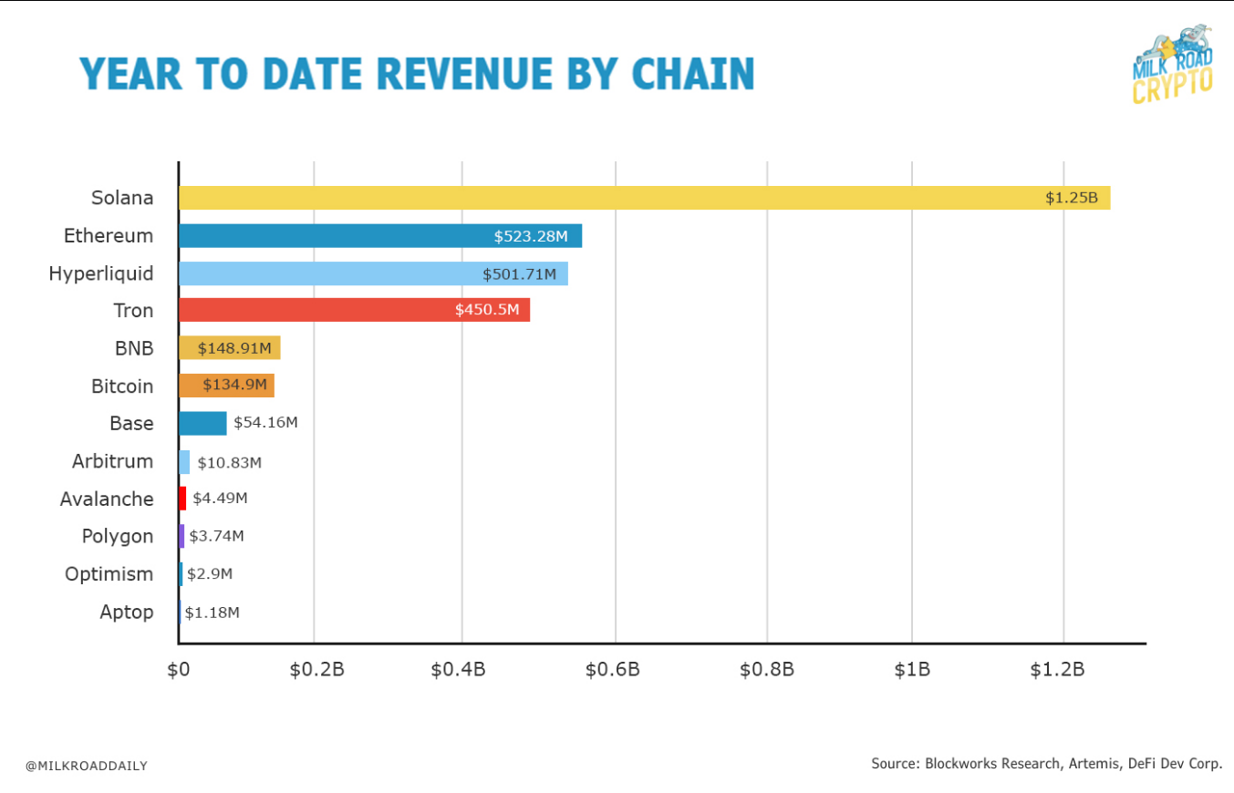 According to data shared by crypto media outlets, Solana has generated $1.25 billion in revenue year-to-date. That is about two and a half times the revenue of Ethereum, which sits at $523 million so far this year.