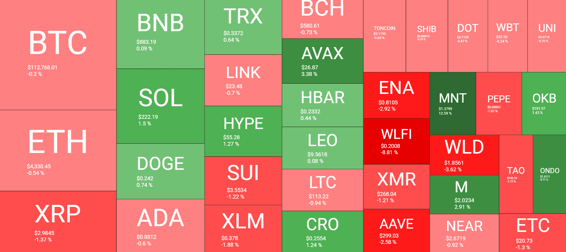 As mentioned above, most of the larger-cap alts have failed to produce any big moves in the past 24 hours. ETH, XRP, ADA, LINK, SUI, and XLM are slightly in the red, while SOL, DOGE, HYPE, TRX, and AVAX are with minor gains.