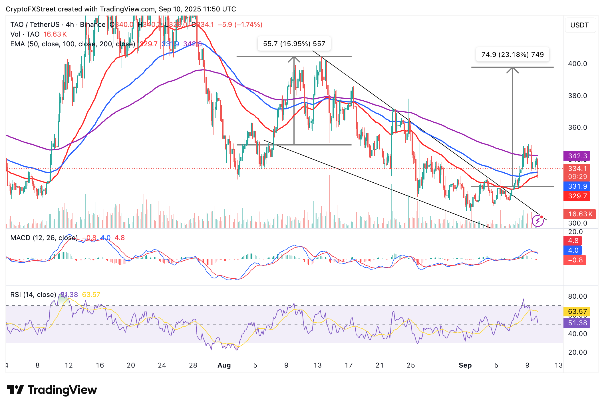 The 100-period EMA at $331 provides the immediate support backed by the 50-period EMA at $329. A breakout above the 200-period EMA resistance at $342 will go a long way to affirm the bullish grip and increase the probability of TAO rising to tag the falling wedge pattern breakout target at $398.