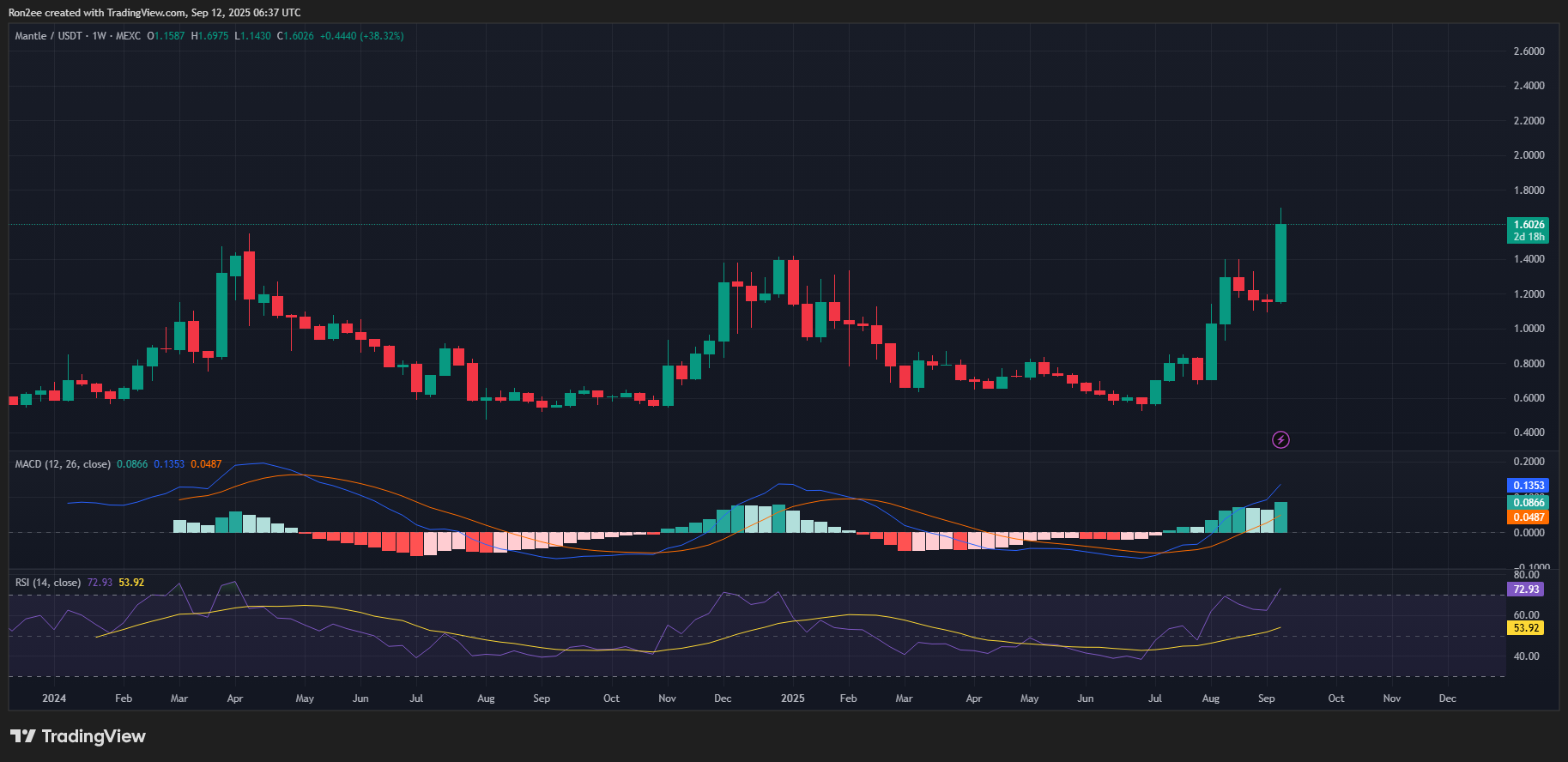 According to data from crypto.news, Mantle (MNT) shot up to an all-time high of $1.68 on Sep. 12, morning Asian time, before settling a little lower at $1.61 at press time. At this price, it is up 35.5% over the past 7 days and 55% over the last month. It also extends the token’s gains from its year-to-date lows to over 130%