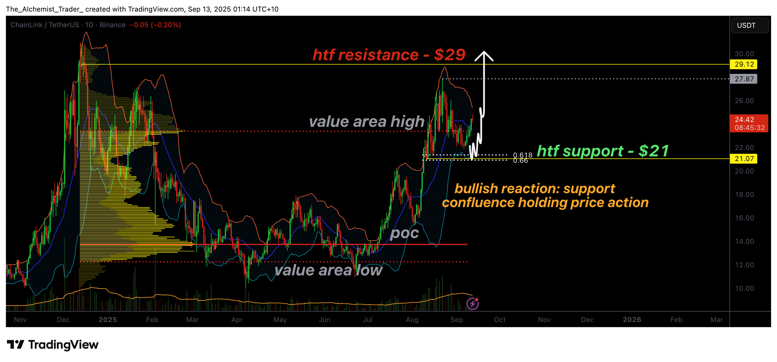 - Support Zone: LINK holds $21 support with confluence from the 0.618 Fibonacci, Bollinger Bands, and value area high.