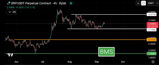 Although the XRP price is currently inching slowly upwards, technical analysis shows it is yet to break above a technical resistance keeping it from price recovery. According to a technical analysis of the XRP 4-hour candlestick timeframe chart that was posted on the social media platform X by CoinsKid, XRP’s movement in August was capped by a resistance line at $3.3774. This resistance is represented with the white trendline in the price chart below.