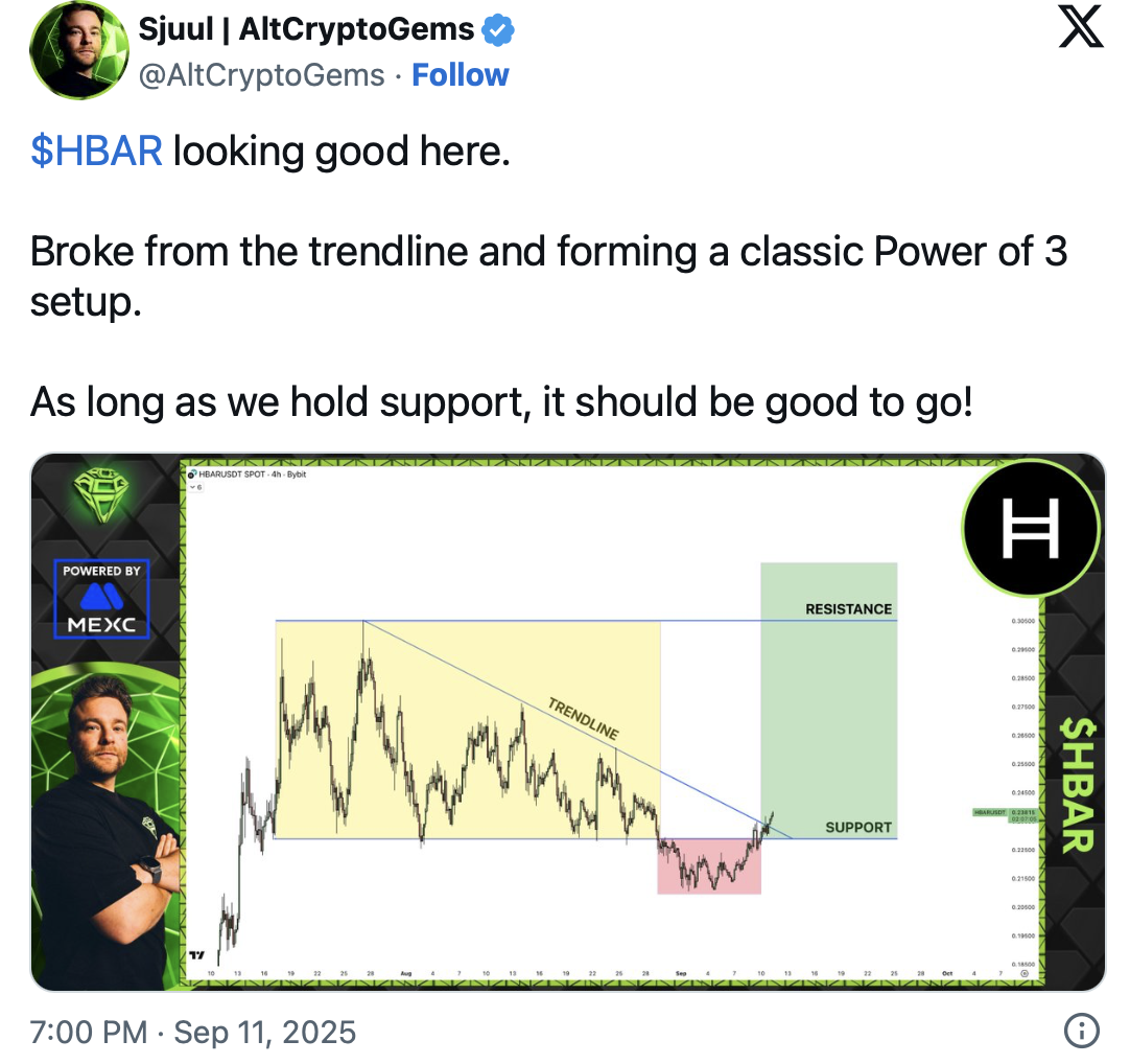 Meanwhile, expert trader Sjuul noted a strong bullish momentum after the asset broke above its descending trendline. In his chart, he highlights a classic “Power of 3” setup, signaling that the token may now be entering its expansion phase. This pattern often leads to sustained upside as long as support holds.