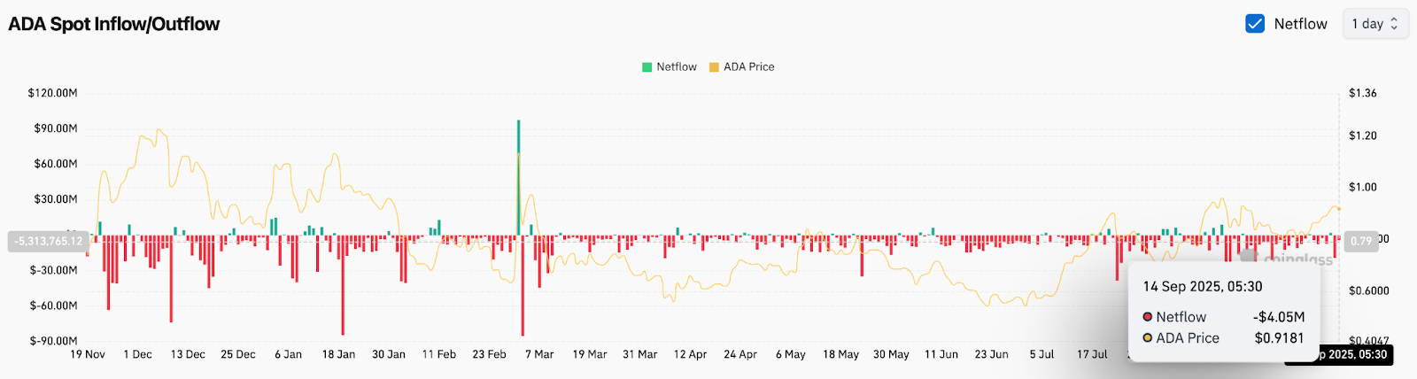 Exchange flow data highlights cautious positioning. On September 14, ADA recorded a net outflow of $4.05 million, extending a series of mixed flows observed throughout September. While net outflows typically suggest accumulation, the scale of these moves has remained modest compared to earlier cycles.