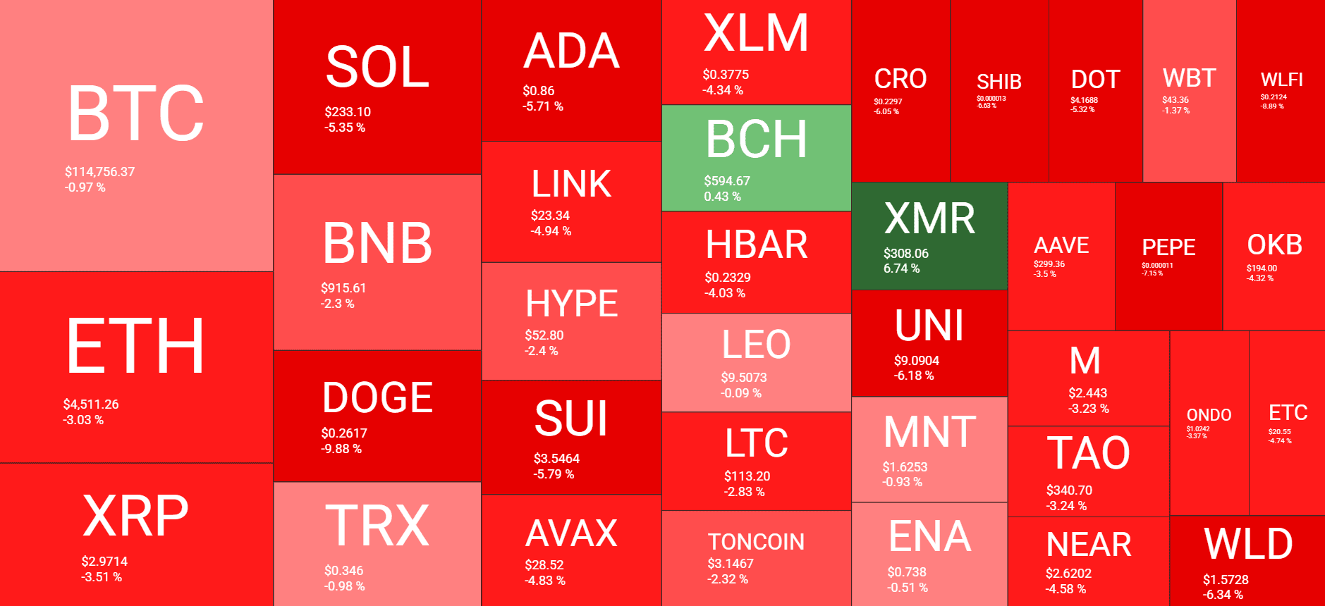 Ethereum failed at $4,750 during the weekend and is now just inches above $4,500 after a 3% daily decline. XRP has slipped below a key support level following a 3.5% drop. XMR is the only exception from the larger-cap alts, surging by 8% to almost $310.