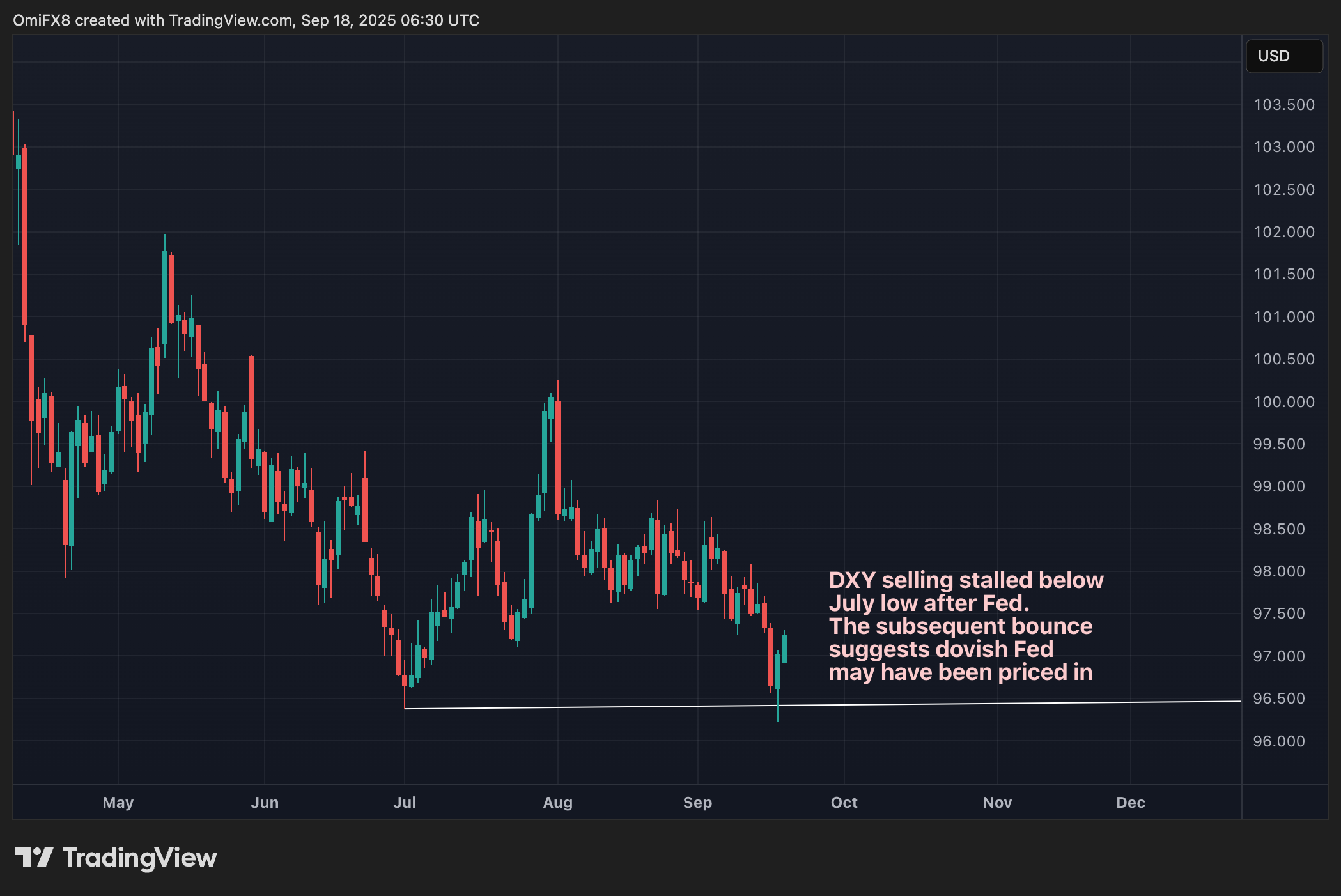 Perhaps the Fed's dovishness is already factored in by the foreign exchange markets. After all, the DXY has dropped 10% this year largely on the back of Fed rate cut bets. BTC, too, has rallied by 25% this year, hitting new highs above $124,000 in August, supported by dovish Fed expectations.