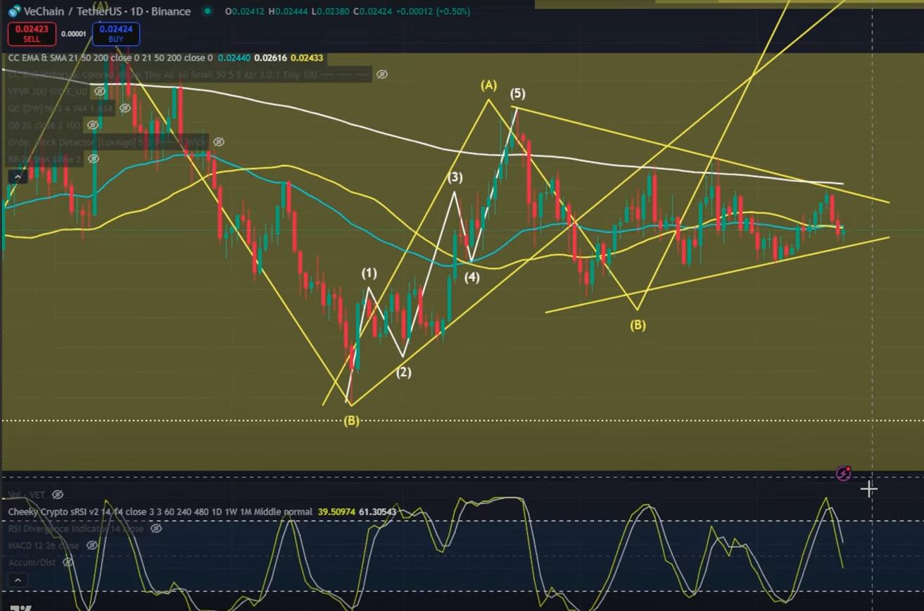 VeChain’s native token, VET, is unfolding in a narrow band that might soon yield to a sharp increase in price, as shown in Cheeky Crypto Trading’s new analysis. The Binance chart of VET/USDT on a daily basis shows that there is a complicated Elliott Wave pattern that shapes a possible triangle pattern.