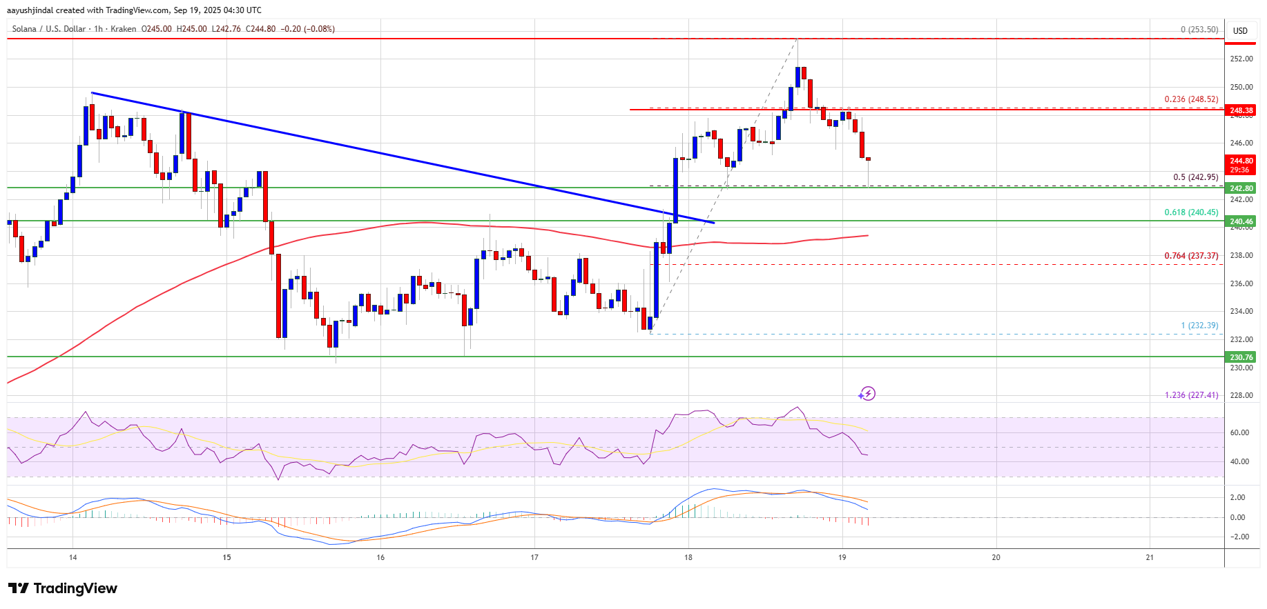 If SOL fails to rise above the $248 resistance, it could start another decline. Initial support on the downside is near the $242 zone and the 50% Fib retracement level of the upward wave from the $232 swing low to the $253 high. The first major support is near the $240 level.