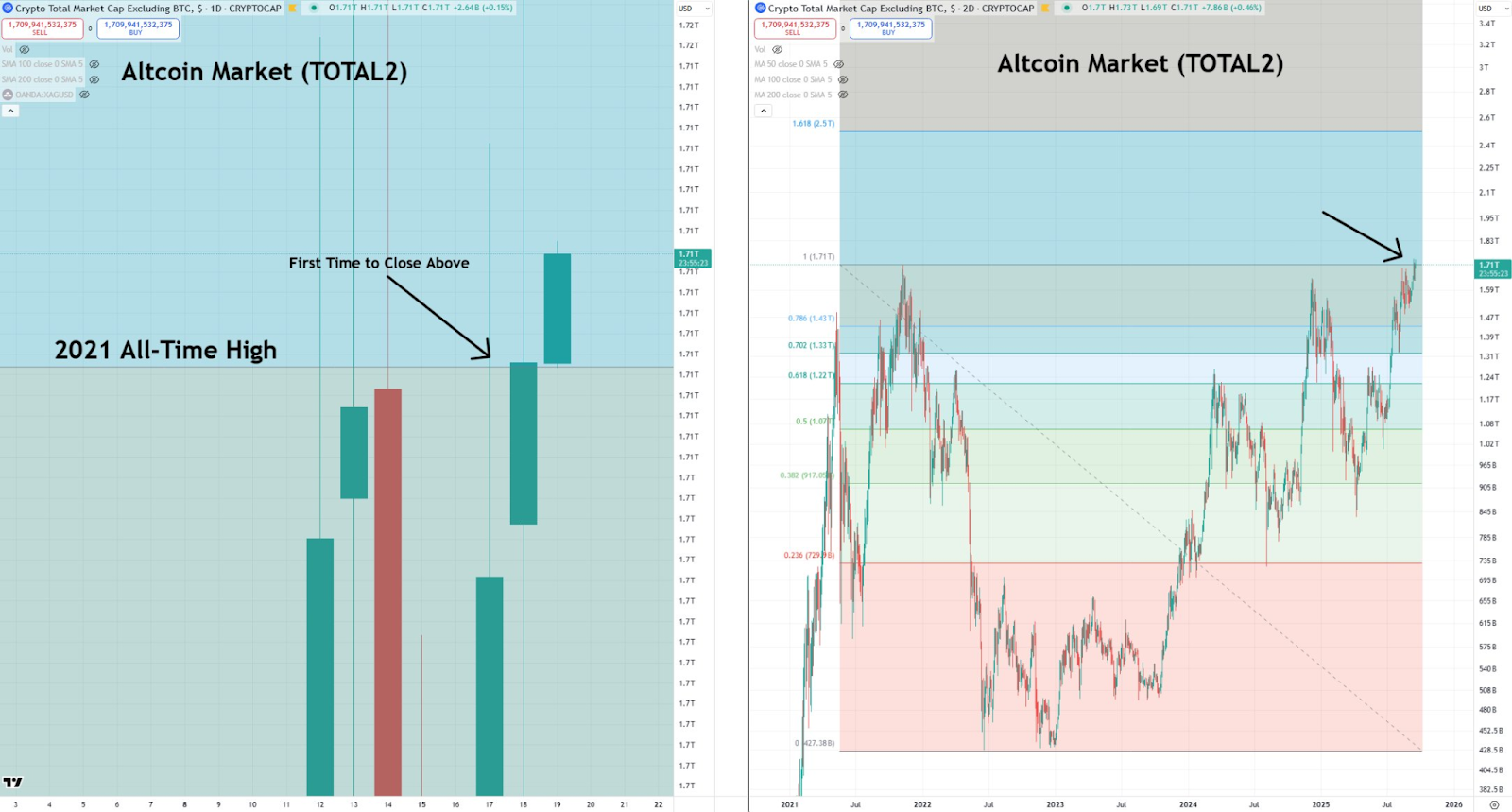 • Altcoin Market (TOTAL2) closes above 2021 ATH, confirming Altseason 2025 with ASI above 75 for two consecutive days.