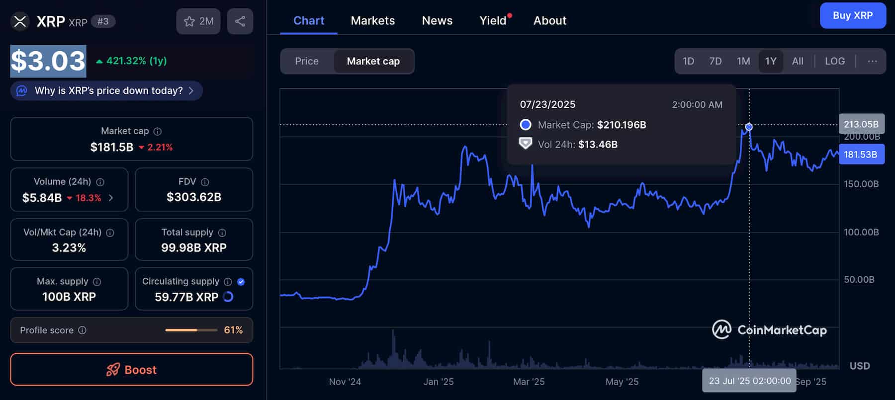 XRP is currently the third-largest cryptocurrency, with a market cap of $181.5 billion and a circulating supply of 59.77 billion tokens. At its peak in July 2025, XRP briefly reached a market cap of $210 billion, but it trades today at $3.03.