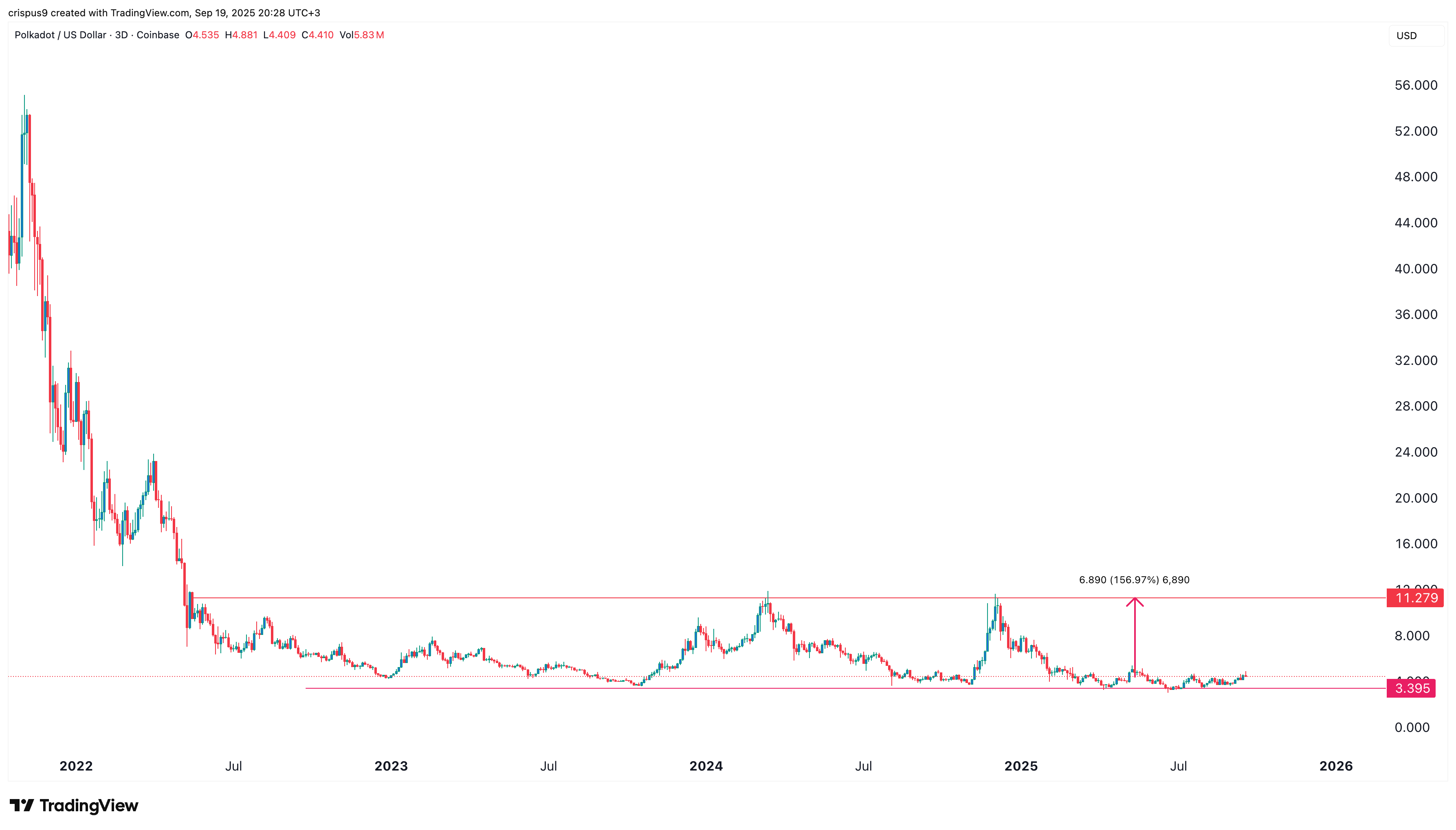 The weekly chart shows that the Polkadot crypto price has remained in a three-year consolidation between $3.39 and $11.20. It has failed to move below this support even in the worst of crypto bear markets.