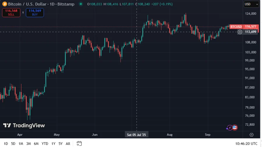 BTC’s long-term outlook shows robust bullishness, with market observers predicting the asset to reach $180,000 before the end of the year. The asset’s price currently hovers at $116,544, up over 1.2% and 2.3% over the past week and month, respectively, signifying stability and continued purchasing frenzy.