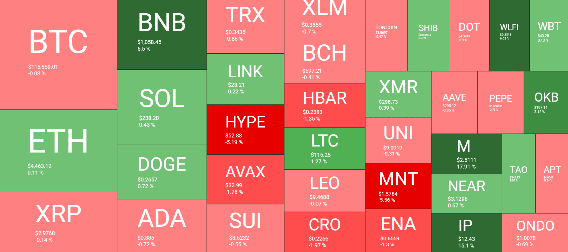 In contrast, ETH, XRP, SOL, DOGE, ADA, TRX, LINK, AVAX, and SUI have made no big moves, while HYPE has plunged by over 5%.