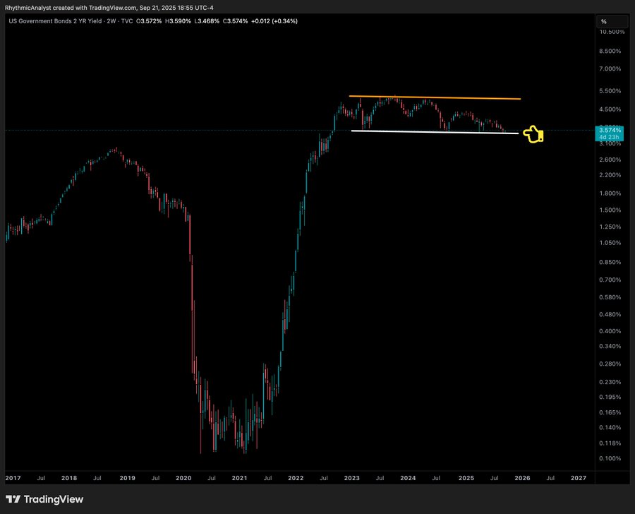 But now, they sit at a critical support level, and the 2-year bond yields have already triggered a downtrend, it’s just that a new low hasn’t been made yet. If they drop further, it could shift global markets.