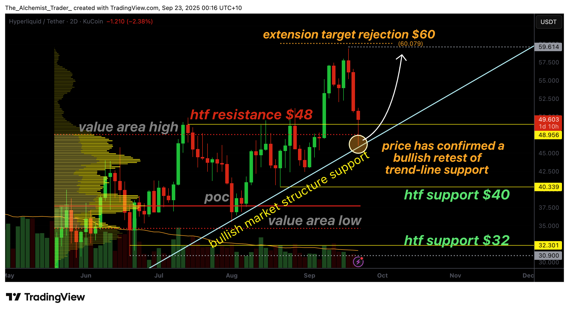 The key levels to monitor in the coming days are the value area high and the high-time-frame resistance at $49.00. Reclaiming these levels on a closing basis would confirm that bulls remain in control and set up continuation toward $60.00 and beyond.