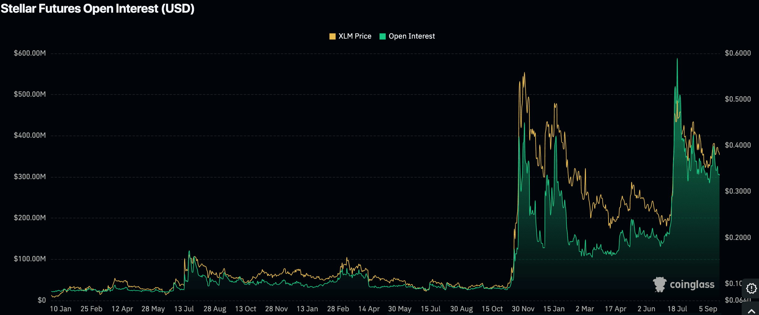 Data from Coinglass shows that XLM futures open interest surged in late October and early November, peaking above $500 million during a strong price move toward $0.60. Since then, open interest has declined along with price, returning to more moderate levels.
