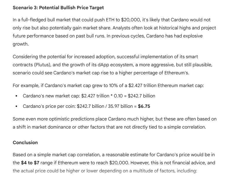 Meanwhile, Google’s Gemini AI had a different approach to predicting the price of Cardano if Ethereum reaches $20,000. The first scenario is if the ADA/ETH ratio remains constant.