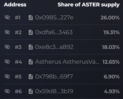 Data from Bubblemaps shows the top six wallets hold 93.14% of ASTER’s supply. The top three: 44.7%, 19.6%, and 13.86% in the “AstherusVault.”
