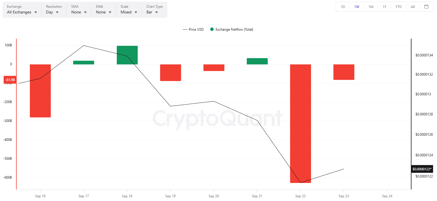 Next on the list is the meme coin’s exchange netflow, which in the past week has turned negative. This means that investors have switched from centralized platforms toward self-custody methods, thus reducing the immediate selling pressure.