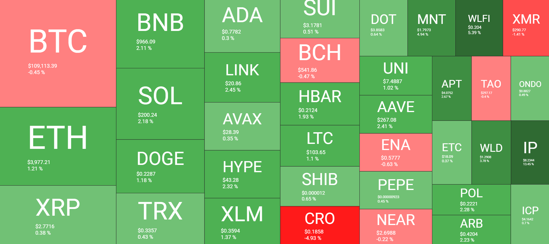 On a daily scale, most larger-cap alts are slightly in the green but in a modest manner. More impressive daily gains come from IP, which has rocketed by 14%, WLFI (5%), MNT (5%), and WLD (4%).