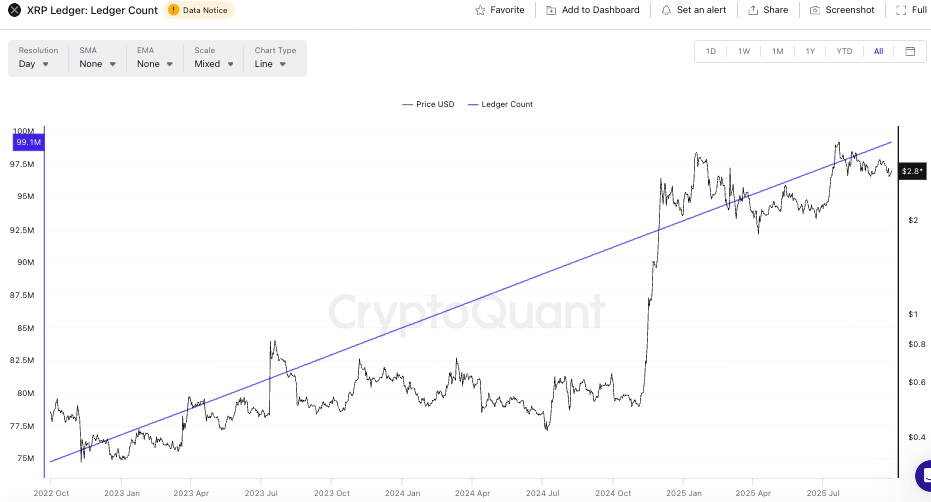 The ledger count has steadily risen since late 2022, reflecting greater use of the XRP Ledger, with the growth closely tracking notable XRP price movements.