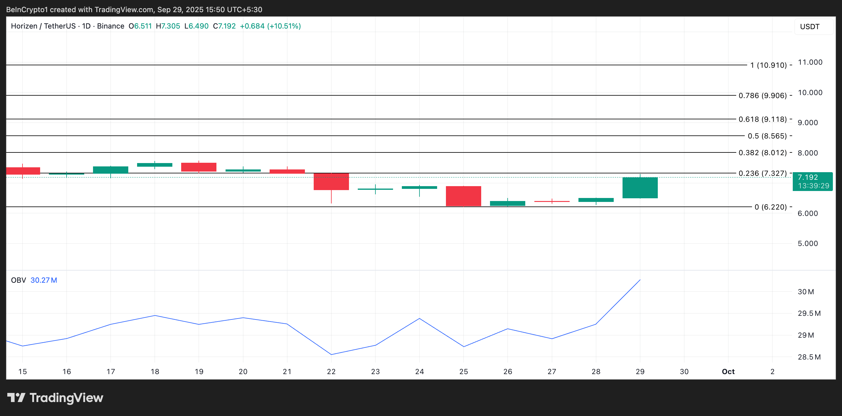 Its double-digit rally is backed by climbing On-Balance Volume (OBV) on the one-day chart, which confirms that buy-side pressure backs the price surge. As of this writing, the momentum indicator is at 30.27 million.