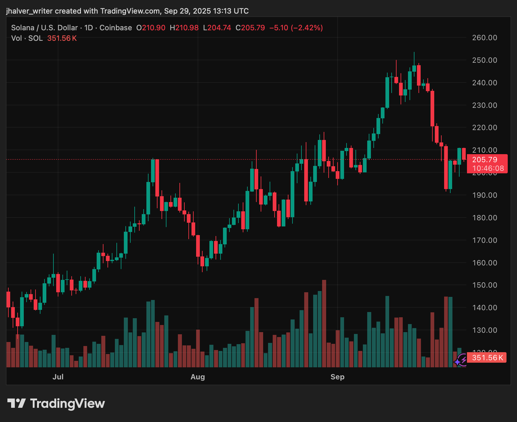 Currently, SOL hovers near $208–$210, up modestly on the day as momentum rebuilds. The market now focuses on $207 as the first support level; a sustained hold preserves the uptrend and keeps a retest of $230–$253 possible, with $257 (the 52-week high) remaining above.