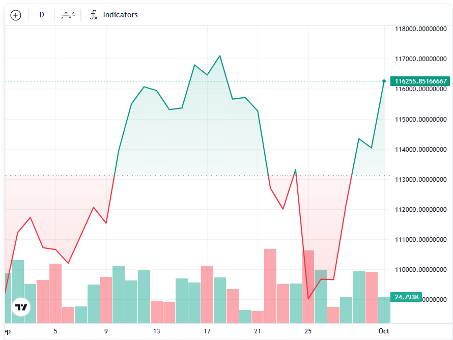 Bitcoin reclaiming the $116,000 level is already a positive sign for the wider cryptocurrency market, which is heading into the “historically positive month of October,” and may set the tone for the rest of the year, Lee said.
