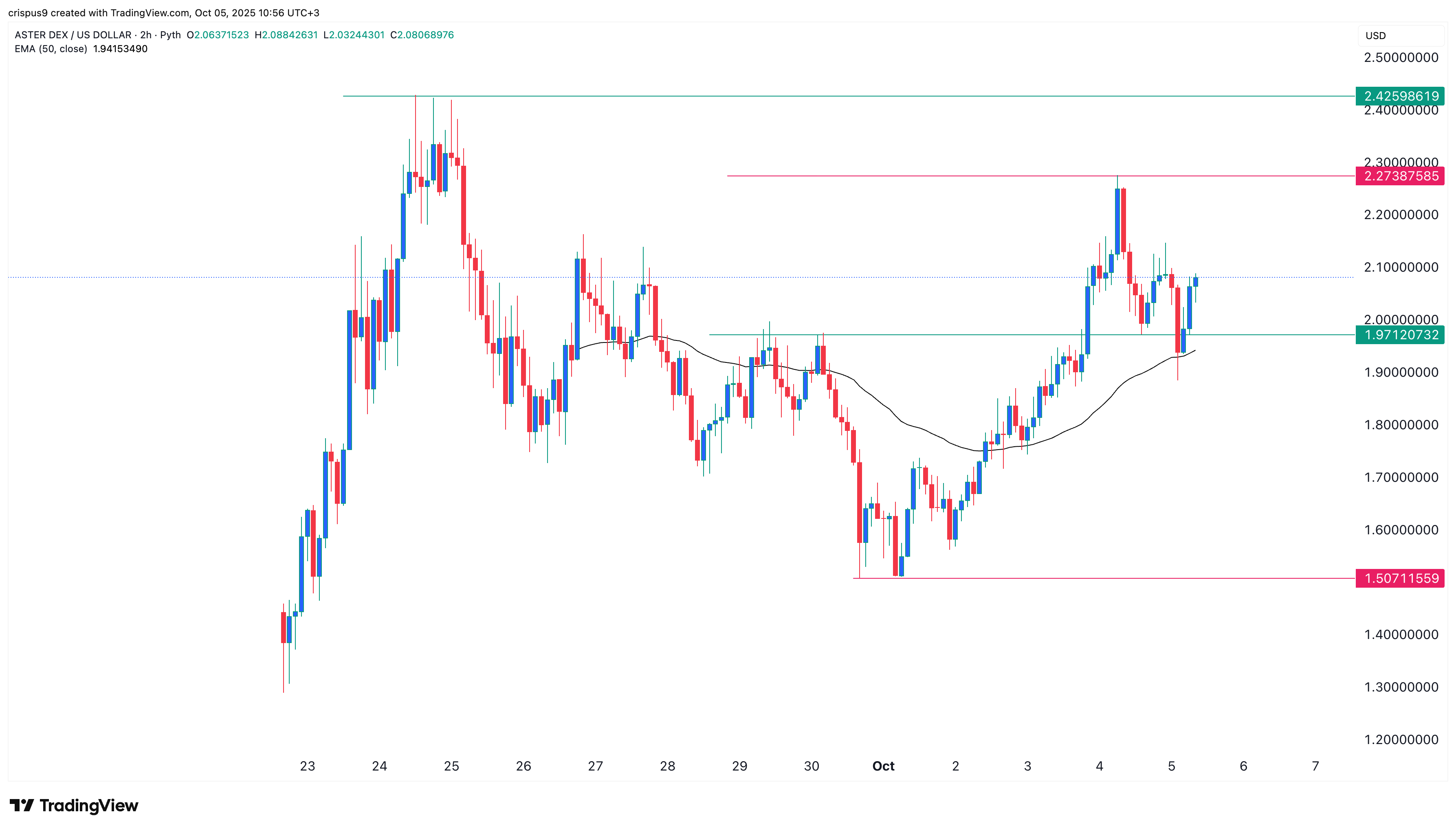 The two-hour chart shows that the Aster Coin price bottomed at $1.5070 on Oct. 1. It then bounced back and reached a high of $2.2738 on Oct. 4.