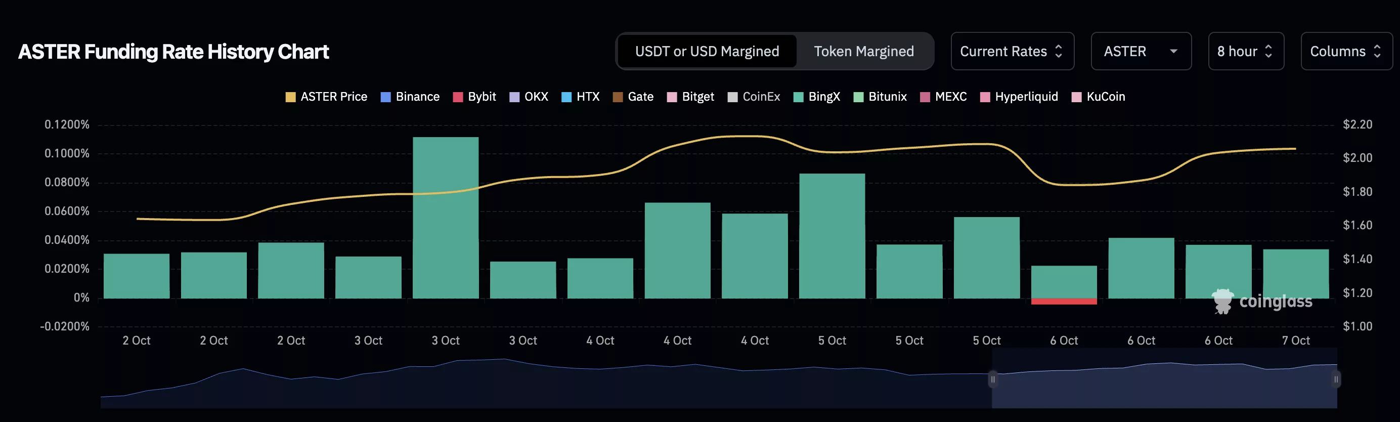 Another crucial factor strengthening Aster’s bullish case is the consistent positivity in funding rates. Traders maintaining long exposure are currently paying shorts to hold positions—often a sign of continued optimism and a market imbalance favoring buyers. The uniformity of these positive funding rates across exchanges further supports the case for ongoing bullish sentiment.