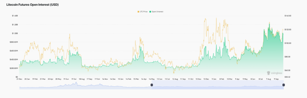 Open interest in Litecoin futures has climbed to around $1.01 billion, rising alongside price; a combination that often precedes heightened volatility.