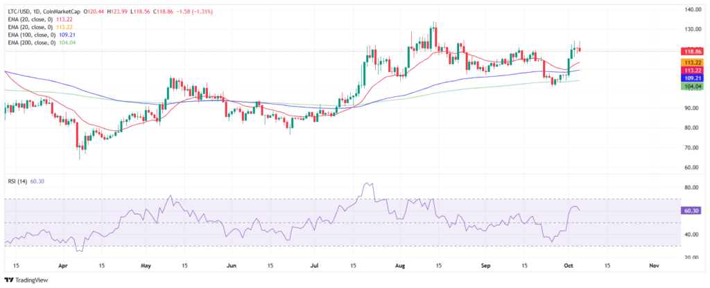 - Litecoin (LTC) is holding strong above $118 despite ETF delay and market caution.