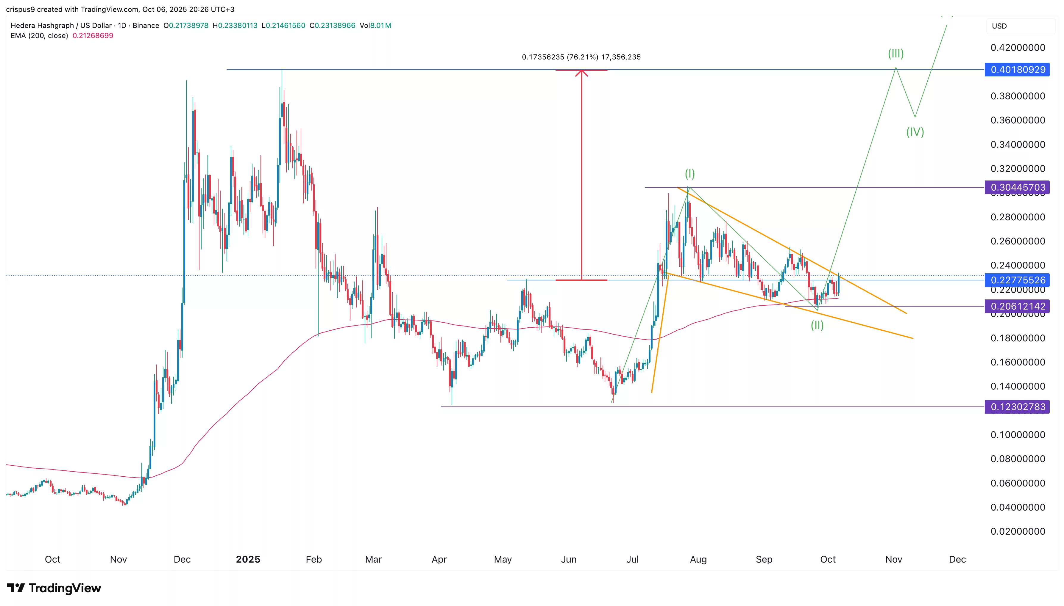 The daily timeframe chart shows that the Hedera price has formed several highly bullish patterns that may lead to a strong breakout. It formed a double-bottom pattern at $0.1230, with a neckline at $0.2277.