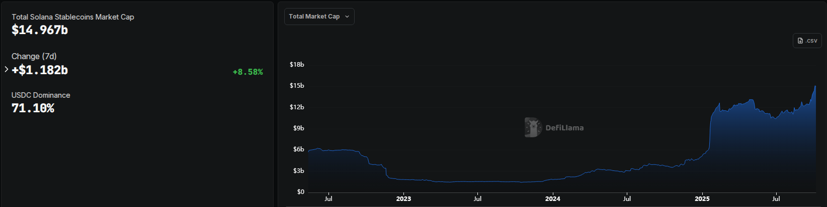 Investors have piled into Solana-linked products and on-chain cash, pushing the network back into the spotlight. Based on reports, the total supply of stablecoins sitting on Solana recently climbed to about $15 billion, a new peak that traders say is adding fuel to activity on the chain.